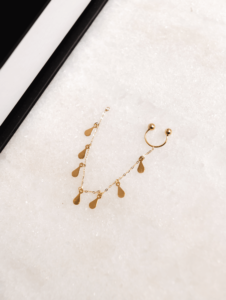 O grande diferencial desse modelo está no fio em ouro18k, que pode ser usado de duas formas: à frente ou atrás do furo da orelha. Esse detalhe versátil permite criar um visual mais ousado ou discreto, dependendo da proposta do look.