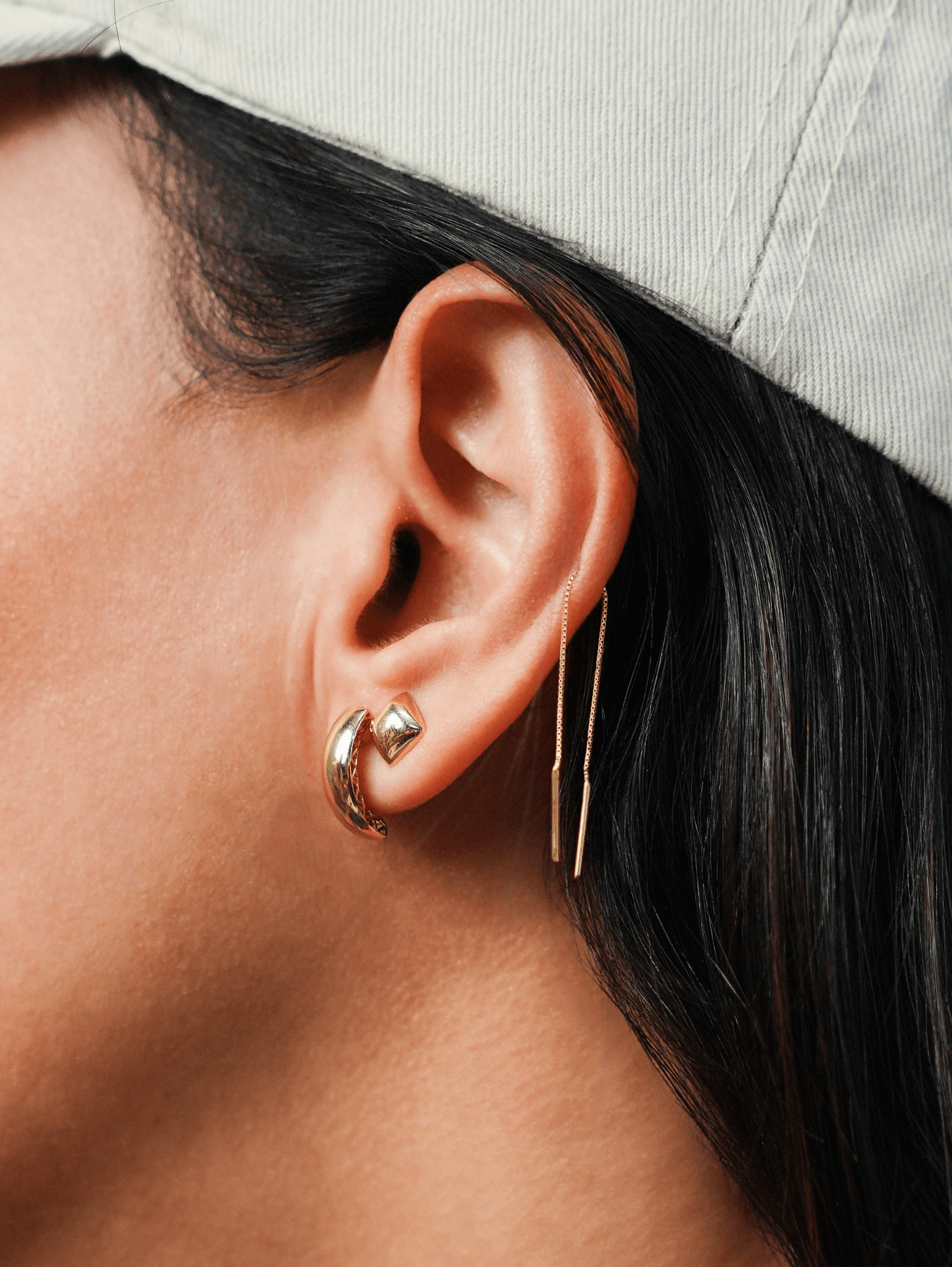 Seu tamanho compacto valoriza o primeiro furo e cria um visual sofisticado. Por isso, o brinco pode ser usado sozinho para uma proposta minimalista e elegante.