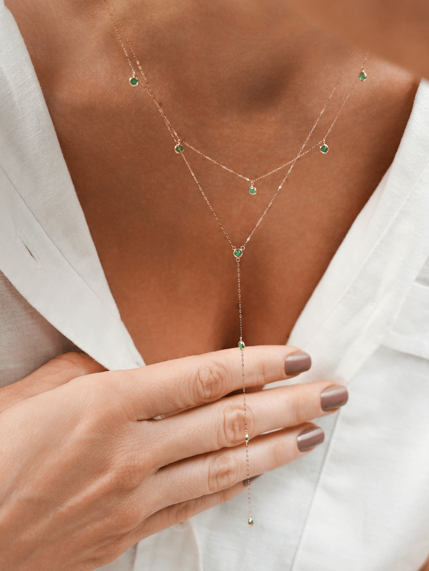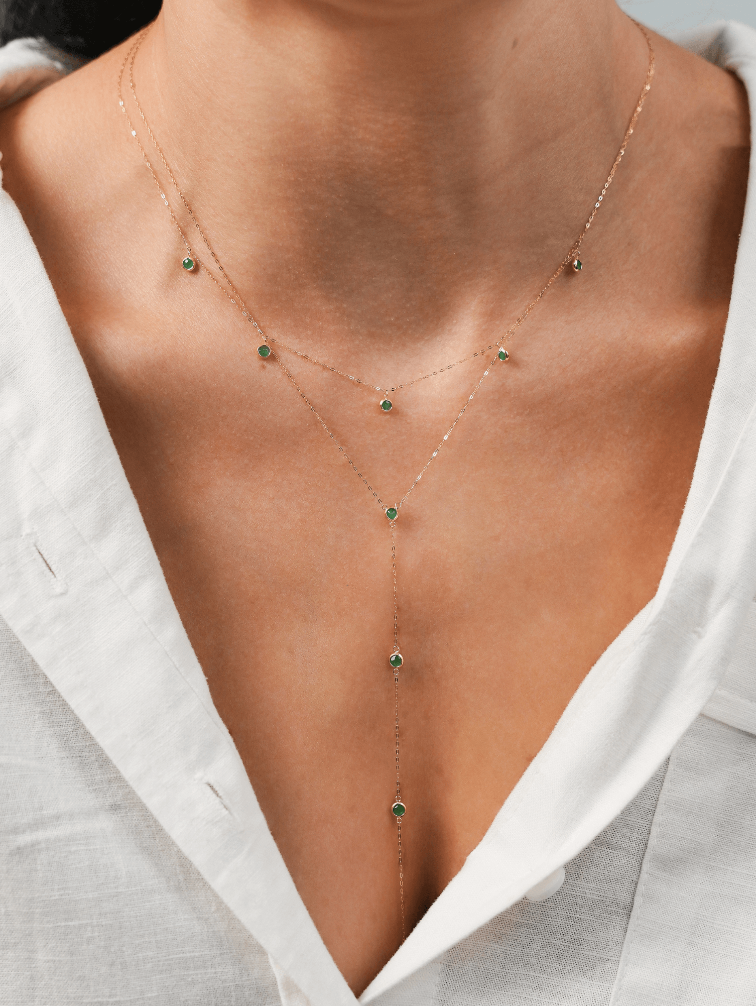 Ao longo da corrente, cinco esmeraldas naturais de 3 mm aparecem de maneira leve e harmoniosa. Dessa forma, as pedras criam pequenos pontos de luz que destacam o verde intenso da gema.