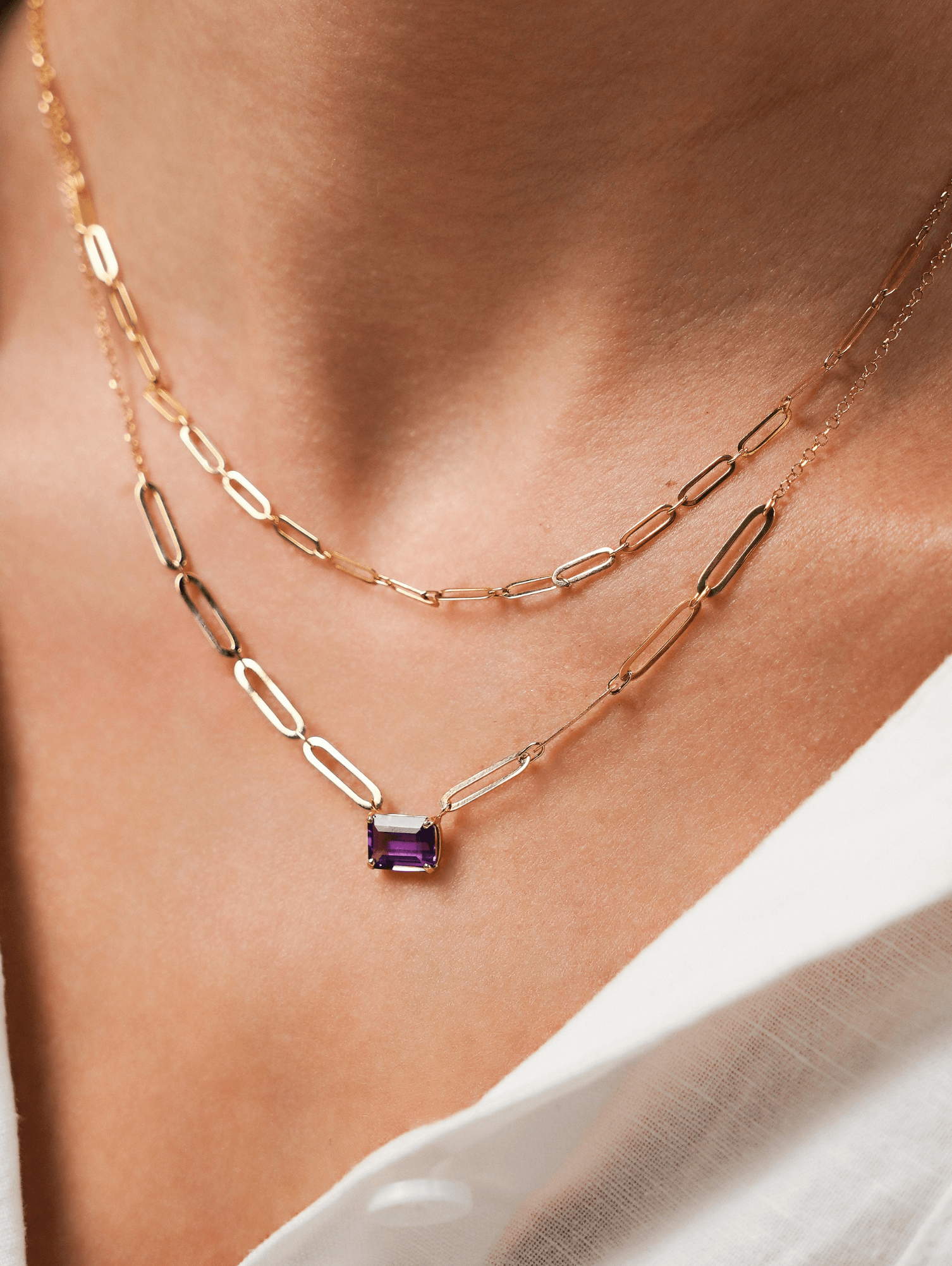O Colar Elos com Ametista Central em Ouro 18k da B Gold Joias une design contemporâneo, pedras naturais e sofisticação em uma peça elegante e cheia de personalidade.