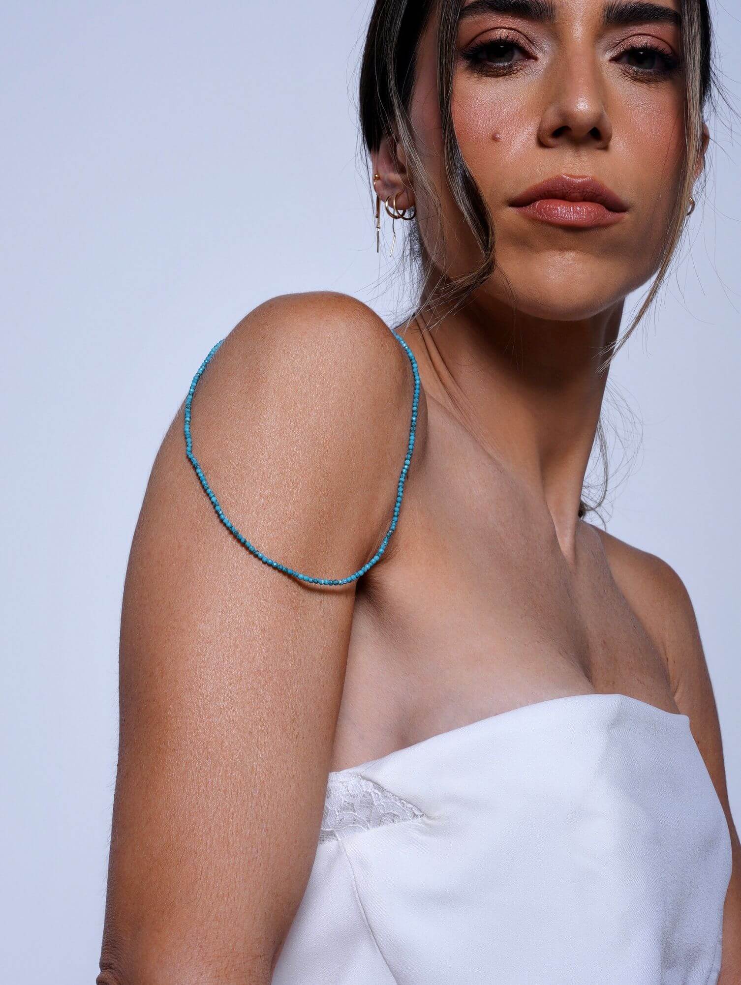 Versátil, ele combina tanto com composições minimalistas quanto com mix de colares. Assim, você pode usá-lo sozinho para um visual leve e elegante ou combiná-lo com outras peças para criar camadas cheias de estilo. Em qualquer proposta, a turquesa sempre traz um toque de cor que transforma o look.